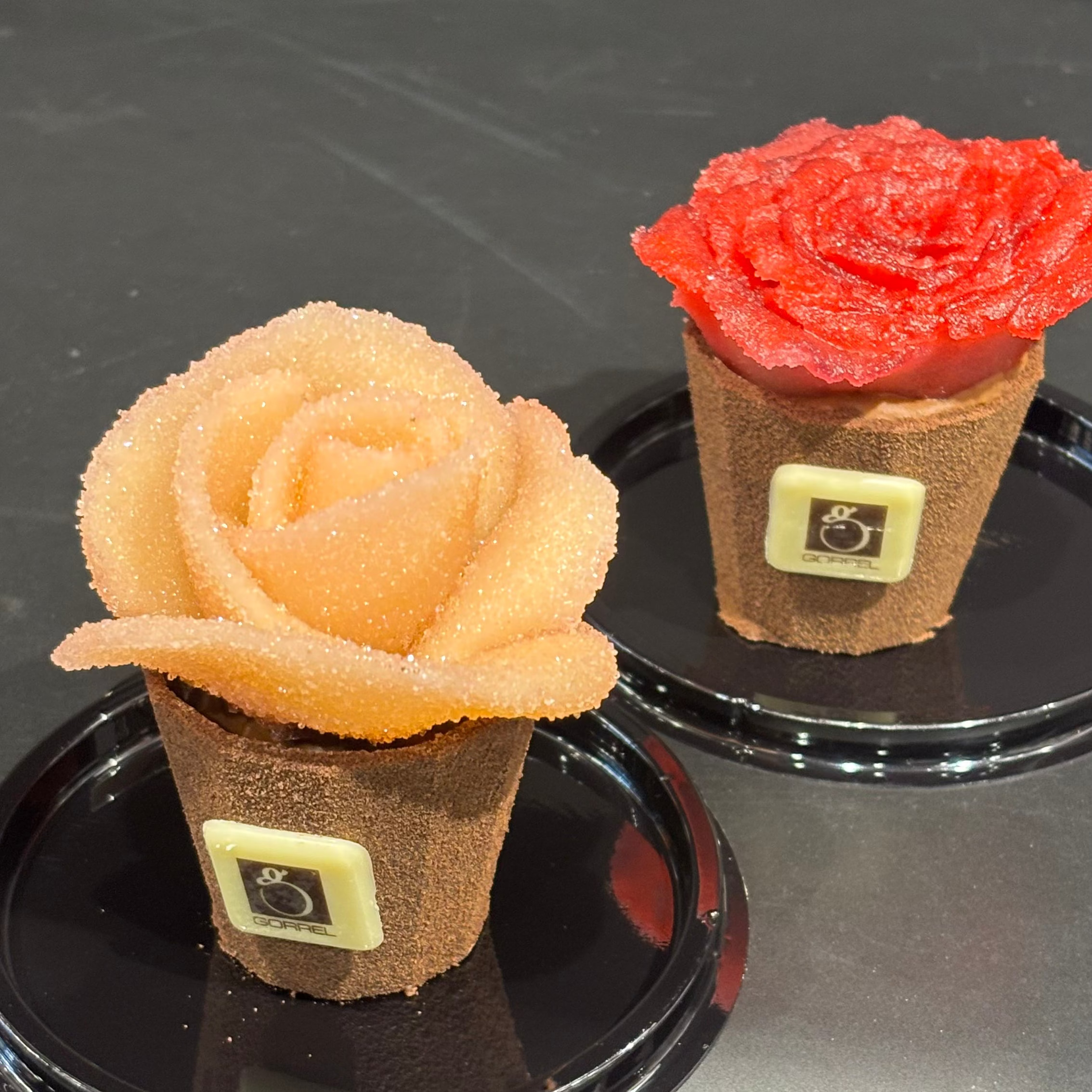 Rose en pâte d’amande délicatement façonnée, posée sur un pot en chocolat renfermant un cœur fondant au praliné.