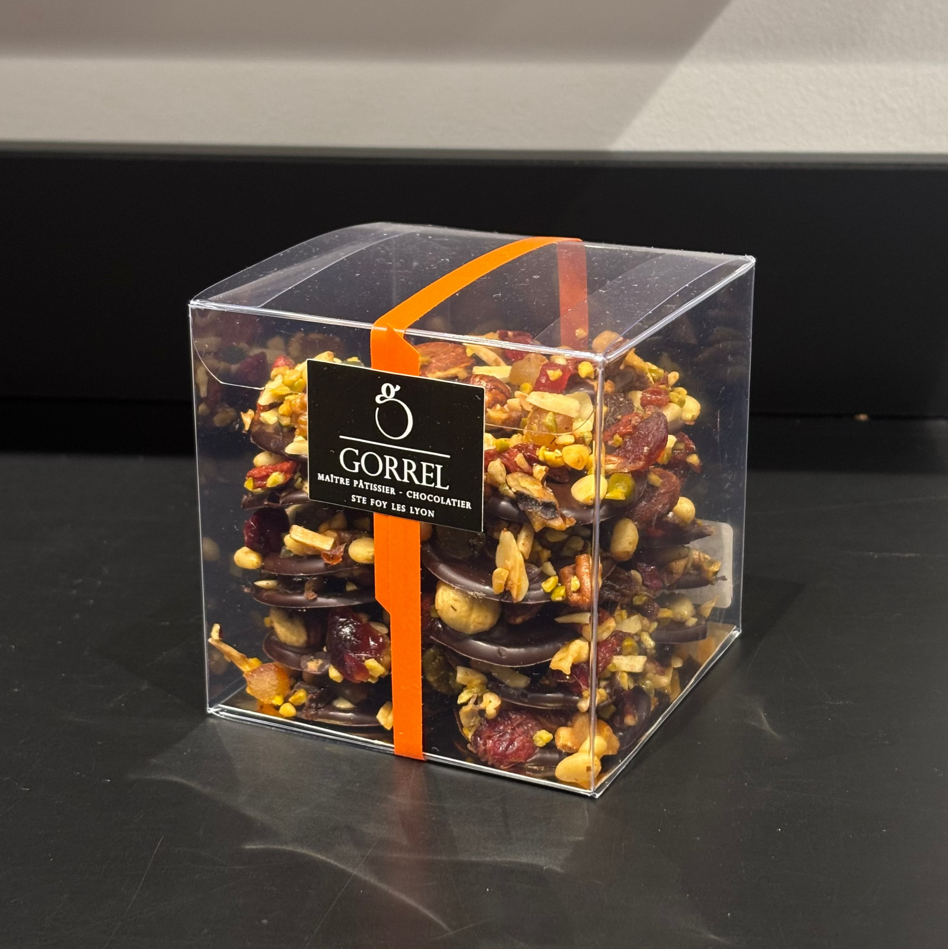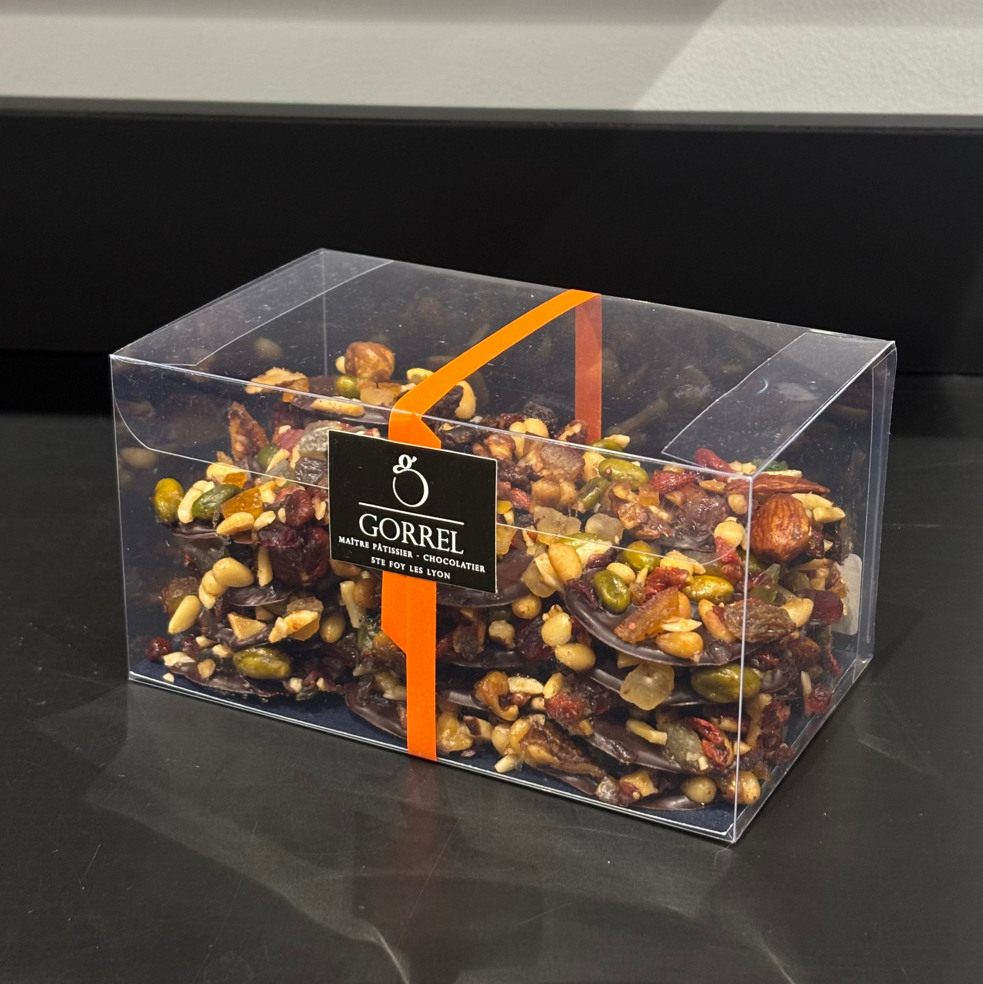 Goûtez à nos délicieux mendiants, créations chocolatières au chocolat noir, raisins secs, cranberries, noisettes, amandes, pistache, pignons de pin et fruits confits.