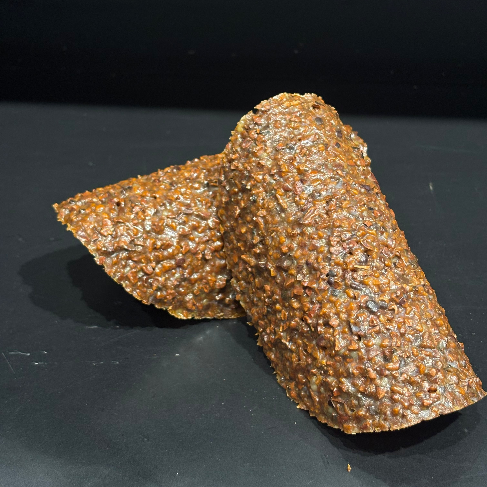 Une grande tuile fine et croustillante, travaillée avec précision dans notre atelier.
